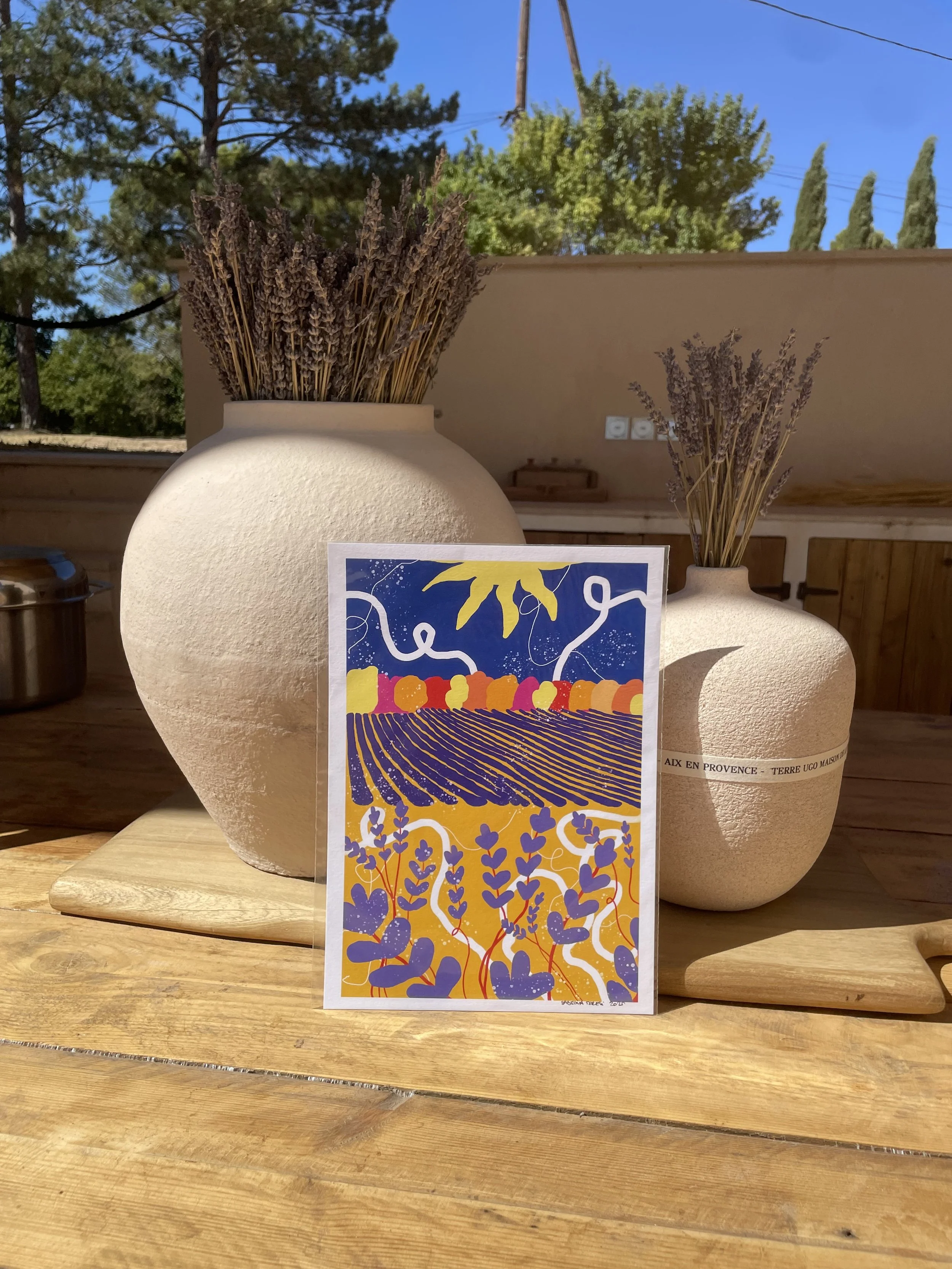 Ce print est né lors de la résidence artistique chez Terre Ugo en juin 2025. Une création directement inspirée de l’énergie, des couleurs et de l’atmosphère unique de ce lieu.